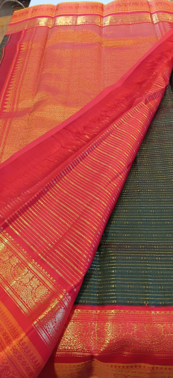 Bottle Green With Peach Thin Border Saree With Butte All Over(Shakthi